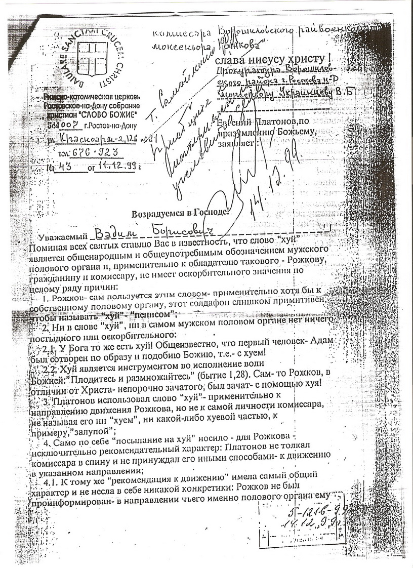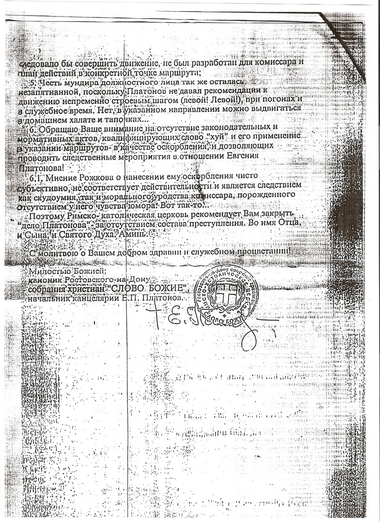 Что делает настоящий российский полковник? Прочтя "божественное" послание, полковник Рожков написал заявление в милицию (что и было его главной ошибкой). Та возбудила уголовное дело об оскорблении. Районный прокурор потребовал разъяснений от святого отца по поводу его несвятого писания. Вот тут-то эпистолярный талант каноника Платонова раскрылся во всем блеске.