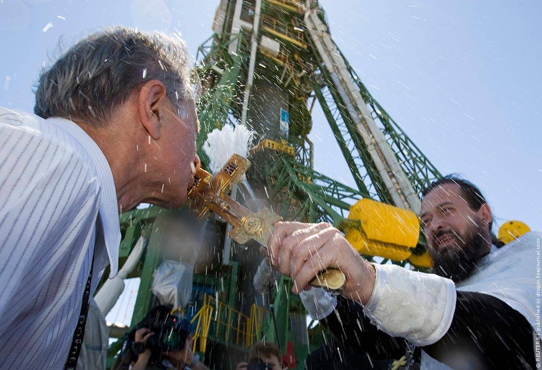 Также прошло освящение и последнего полета к МКС. Иностранцы - японцы-американцы, члены экипажа таращили глаза на небывлое чудо, на попа с метелкой, которой, окуная ее в тазик с водой, он брызгал на стальные конструкции. Потом руководитель полетов приложился к кресту животворящему.