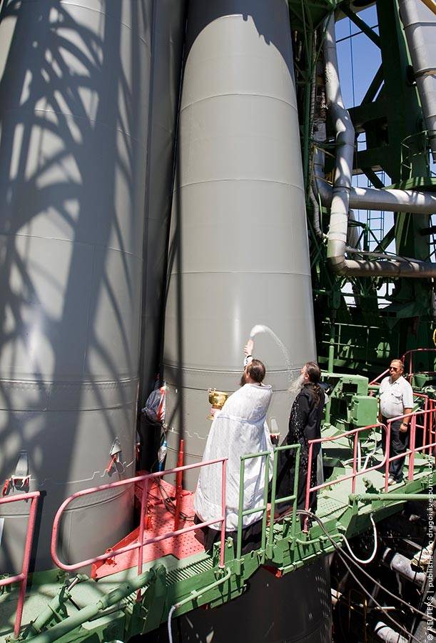 http://tvroscosmos.ru/frm/vestidata/2008/vesti13_12_8_1.phpЕще одно сообщение, свежее:"Сегодня священники байконурского православного храма святого великомученика Георгия Победоносца по традиции освятили ракету-носитель, которая 16 июня должна вывести на орбиту космический корабль "Союз ТМА-19" с экипажем в составе двух американских астронавтов и одного российского космонавта".