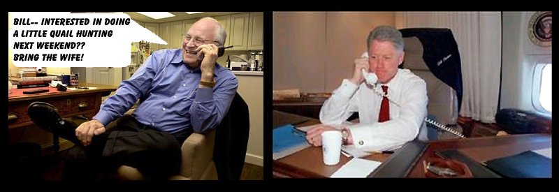 Дик Чейни - по телефону Клинтону: "Билл, не хочешь поехать поохотиться немного на куропаток в конце неделе? Прихвати жену!"