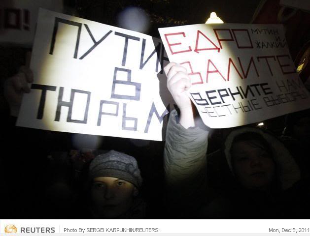 "Putin is a crook and a thief!" referring both to the alleged election fraud and to widespread complaints that United Russia is one of the prime reasons for Russia's endemic corruption.